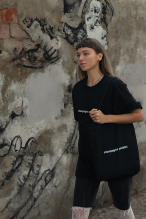 A bold statement for those who appreciate the finer things in life but never forget their roots. The "Champagne Socialist" t-shirt is crafted from 100% soft cotton, offering an oversized fit for effortless style. The minimalist front print adds a subtle edge, making it perfect for casual outings, wine tastings, or just making a statement at your favorite bar.