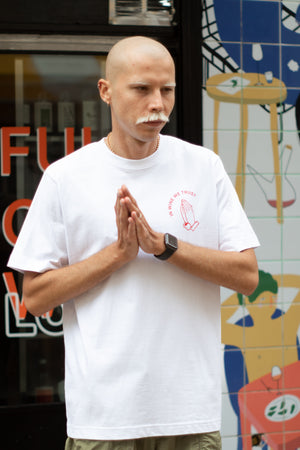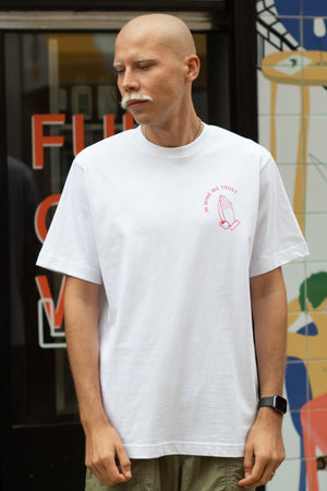 A minimalist statement piece for true lovers of natural wine. Crafted from premium white cotton, this t-shirt features a clean, subtle print with the phrase "In Wine We Trust" and praying hands—symbolizing respect for the culture of wine and the philosophy of low-intervention winemaking.